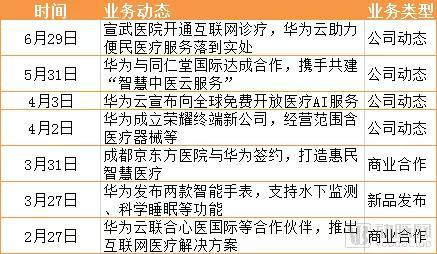 在今年上半年,华为在医疗业务上动作频频。3月份,华为发布了2款智能手表,支持水下监测、科学睡眠等功能;到4月份时,其成立了荣耀终端新公司,经营范围涵盖了I类、II类和III类医疗器械的销售,同月,华为云宣布向全球免费开放医疗AI服务。