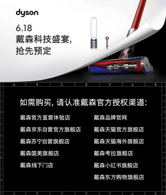 从戴森官博贴出的说明图来看,戴森官方授权渠道几乎囊括了主流电商平台,除了淘宝、京东外,还有苏宁、国美,主打内容电商的小红书也在名单之列,却独独缺了拼多多。