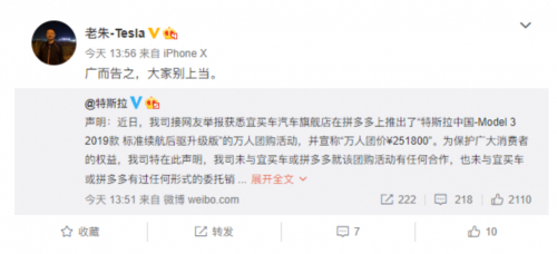 活动预约开启不久后,特斯拉发布声明称,这次团购活动与特斯拉无关,未向此次团购活动中售卖商品的店铺宜买车或拼多多委托销售服务,末了,补充了一句,“如消费者因上述团购活动产生任何争议或权益受损,特斯拉不承担任何责任”,颇有些避之不及的意味。特斯拉大中华区总裁朱晓彤还转发了官方微博,“广而告之,大家别上当。”拼多多随后回应,车子是全新特斯拉,补贴也是真的。