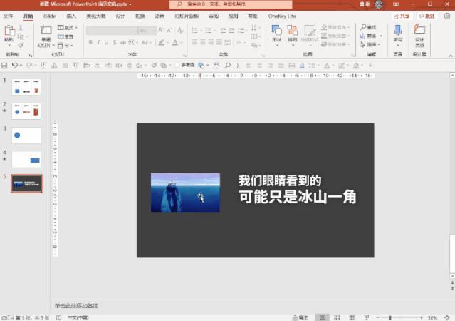 第一步,准备一张符合语境的冰山图片,将冰山部分的图片放大,并且放置在页面的合适位置,添加文本框“我们眼睛看到的可能只是冰山一角”。