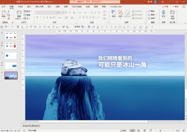 比如,我们希望通过背景图片来烘托金句“我们眼睛看到的,可能只是冰山一角”,就可以通过前后两页PPT的“平滑”切换,营造出这句话的意境。