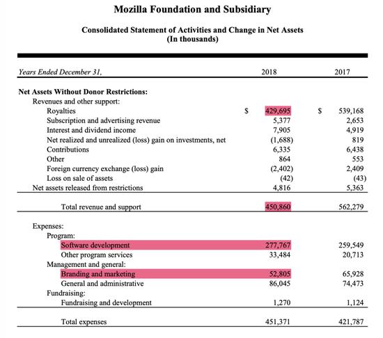 2019年9月,Mozilla公布了Mozilla基金会及公司的财务状况。2018年度总收入是4.5亿美元,其中4.3亿美元来自授权收入(royalties),主要是在浏览器中嵌入搜索引擎的广告,订阅和广告收入是537.7万美元(2018年),占比不足2%。