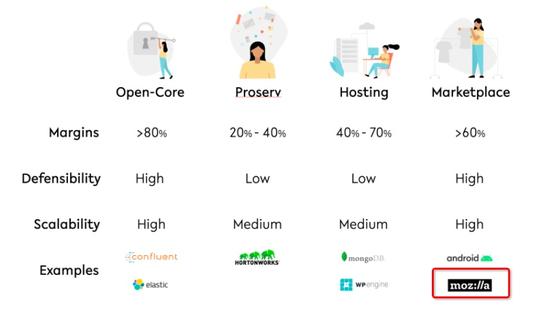 Mozilla的商业模型也是这个,每年约5亿美元的收入中有很大一部分来自为搜索引擎引流。虽然这是一种相对少见的模式,但是现在越来越多的开源初创公司在探索这种“市场”模式。