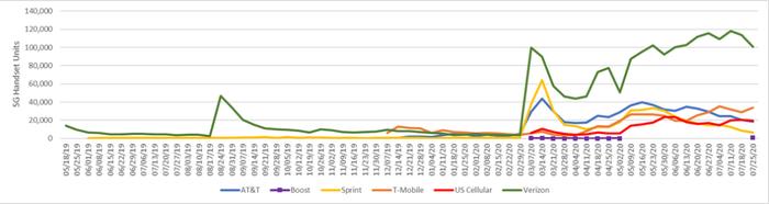 数据显示,到2020年7月中旬,美国市场一共售出410万部5G手机。其中,Verizon累计售出约220万部,AT&T约62.9万部,T-Mobile约50.1万部,Sprint约48.3万部。