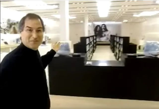 2001年5月19日,首批两家Apple Store商店在美国开业,一家在弗吉尼亚州的Tyson's Corner Center购物中心,另一家在加利福尼亚的Glendale Galleria。史蒂夫·乔布斯正向向记者们介绍。