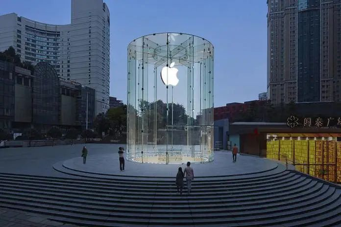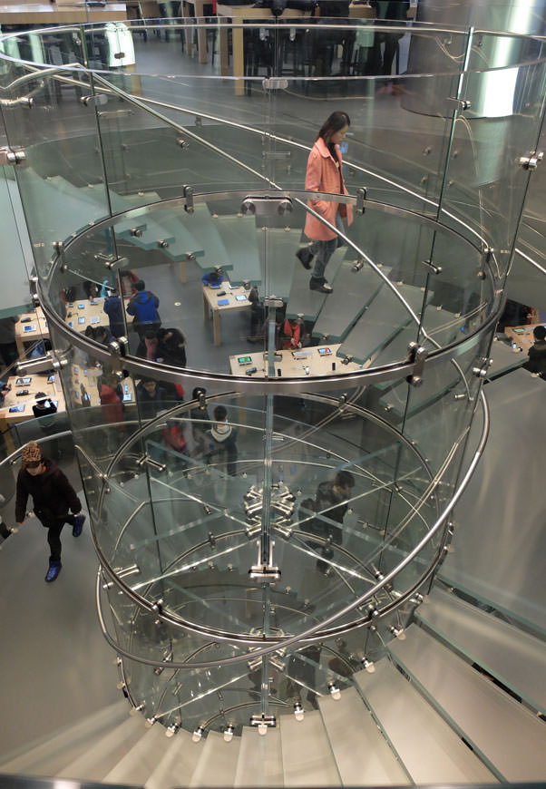 中国第二家苹果商店以崭新的面貌在上海浦东开业。圆柱形玻璃入口在广场的中央成为一个螺旋形玻璃楼梯,通向一个面积为1500平方米的地下商店。