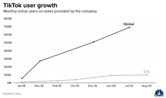这块肉有多肥?据TikTok披露,自2018年1月以来,该应用的月活跃用户增长了近800%。到了2020年6月,TikTok在美国的月活跃用户总数飙升至9100多万。到了8月,月活跃用户超过1亿。