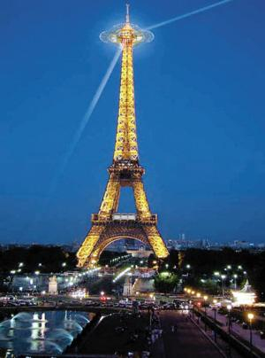 据法国媒体3月21日报道,为了庆祝巴黎艾菲尔铁塔落成120周年,法国政府将于2009年5月为艾菲尔铁塔戴上一顶华丽的“超级帽子”——在铁塔顶部建造一个直径达60米的悬空观光平台。这顶“超级帽子”将以塔身为轴心,悬于地面约300米高处,从空中看犹如巨大荷叶。一旦建成,游客可以一边在悬空的“超级帽子”上云中漫步,一边俯瞰巴黎风光。