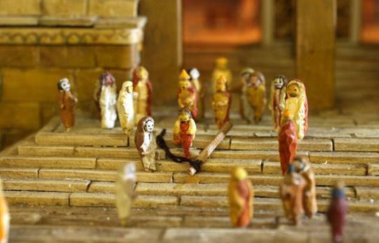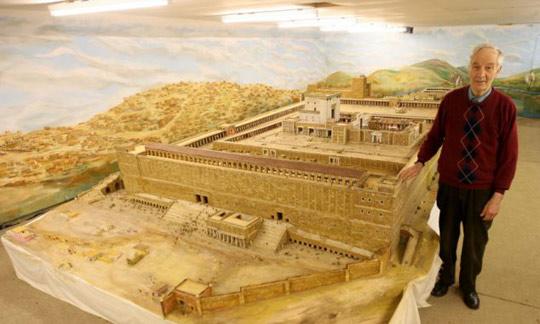 现年78岁的亚历克•杰拉德30年前在自家的花园里,以1:100的比例,重建希律王圣殿模型。他每天都自己烧砖并上漆。此外,他还在模型里制作了4000个人物塑像,每个雕塑就耗时3小时。目前这座模拟圣殿已达20x30英尺。几乎已耗费毕生精力的他,还在不断为这座模型添砖加瓦。