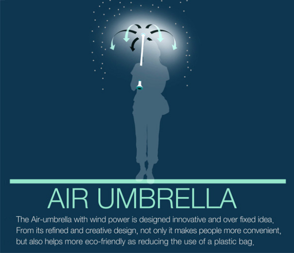 空气雨伞借助风能为使用者挡雨。这是一项富有创新精神的设计,打破了人们对雨伞的固有想法。通过对传统雨伞设计加以改进并添加富有创造性的元素,空气雨伞让用户享受到更大便利。此外,由于减少了对塑料袋的需求,它同样是一款环保雨伞。
