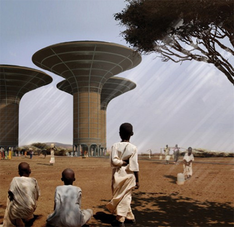 在面积广阔的苏丹沙漠,淡水成为最宝贵的资源之一,获取淡水的难度超乎人们想象。有意思的是,沙漠地下深处也隐藏着世界上最大的地下湖,如果能够有效加以利用,当地居民的生活便会发生翻天覆地的变化。波兰建筑事务所H3AR提出了一种解决之道,即建造外形好似当地猴面包树的水塔群并利用地下泵抽水。水塔内建有一个水处理厂、一所医院、一所学校以及一个食物储藏中心。