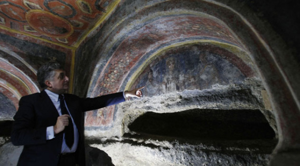 新浪科技讯 北京时间6月24日消息 据国外媒体报道,梵蒂冈官员22日在记者会上宣布,他们在罗马圣保罗大教堂附近一个地下墓穴发现了耶稣门徒已知最古老的画像。这一正面画像可追溯至4世纪末,刻画了耶稣12位门徒中3位门徒——圣·彼得、圣·安德鲁和圣·约翰以及他去世后成为他的门徒的圣·保罗。