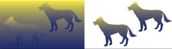 在背景影响下,同样的颜色看上去会有所不同。在这幅错觉图中,背景也让不同颜色看上去类似。在第一个对比图中,左侧和右侧魔方顶面的红色块或多或少地呈现出同样的颜色。如果去除其他色块并用白色取代,左侧魔方的红色块实际上呈现出橙色,右侧魔方的红色块则为紫色。