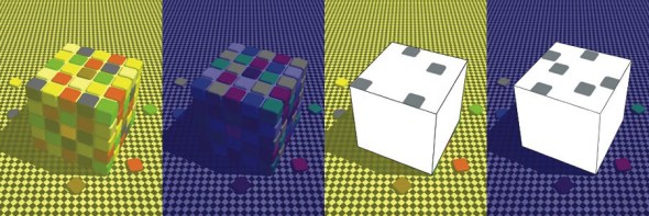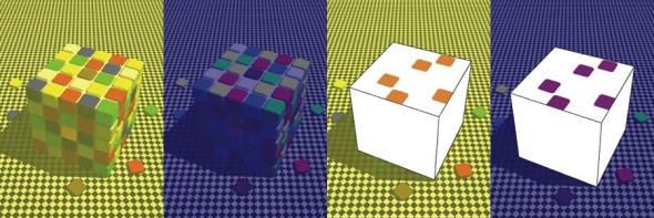 魔方是一种三维智力玩具,玩家需要不停转动魔方,直到每一面上的9块都是同样的颜色。这听起来似乎很容易,但只有在光照条件稳定时才是如此。正如杜克大学的比努·罗托和戴尔·普维斯绘制的这幅错觉图所展示的那样,如果改变光照条件,我们便很难对颜色进行辨别。如右侧被去除一些色块的对比图所示,在白光照射下,左侧的蓝色块和右侧的黄色块实际上均呈灰色。从严格意义上讲,色觉并不基于到达视网膜的光线的波长,大脑根据光照条件分配颜色,波长只是一种指导,用于确定在同一场景下哪些物体比其他物体更红或者更蓝。