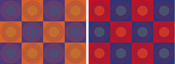 这是大脑根据背景确定颜色的另一个例子。在左侧国际象棋棋盘的“牛眼”结构中,中部的环看上去似乎呈绿色或者蓝色,而实际上,它们却颜色相同,都是绿松石色。右侧国际象棋棋盘的中部环均为黄色。与前面的图片有所不同的是,这种类型的错觉很难用拮抗过程加以解释,原因在于环外表呈现的颜色与背景更为接近,而不是差异较大。