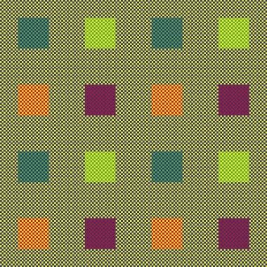 在这幅背景为灰色的图片中,我们看到了4种不同颜色的色块。它们的颜色真的不同吗?答案是否定的。这里的灰色实际上是很小的蓝色和黄色像素的混合产物。由于这些像素太小,混合在一起不会引发拮抗过程,也就无法形成对比。彩色电视机之所以能够利用颜色差异很小的像素呈现不同色彩就是这个原理。(感兴趣的读者可以用放大镜亲自验证一下)绿松石色和淡黄绿色色块实际上分别由很小的绿色像素与蓝色背景像素混合和与黄色背景像素混合而来。红色像素与背景中的黄色像素混合形成橙色,与背景中的蓝色像素混合则成紫色。