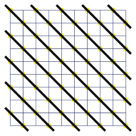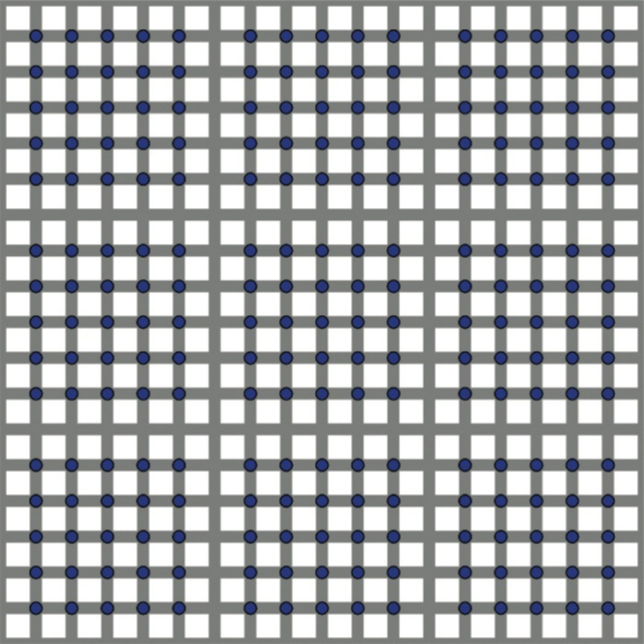 这幅错觉图名为“蓝宝石之光”,由北冈秋吉绘制。在你移动视线时,图中的蓝点似乎在闪烁。但如果盯住一个点,这种发光便消失踪影。与视线外的点相比,处在视线焦点上的点蓝色似乎更为饱满。“蓝宝石之光”所描绘的实际上就是德国阿伦验光研究所的埃尔克·林格巴赫以及同事迈克尔·斯库拉夫、伯恩德·林格巴赫以及尤金·韦斯特在1994年发现的闪烁网格错觉现象。