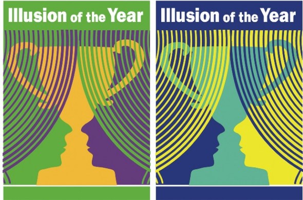 年度最佳错觉图结合了怀特效应(窗帘后面的花瓶似乎呈现出不同的颜色)和著名的面部-花瓶错觉(花瓶被换成获胜者的奖杯)构成。