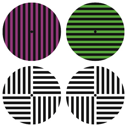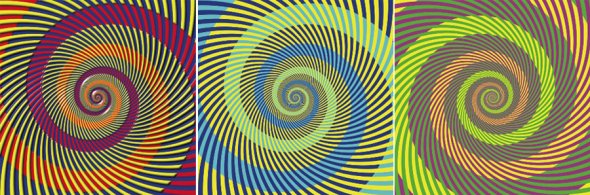 这些螺旋图案由北冈秋吉绘制,是怀特效应影响颜色呈现的典型例子。绿色和奶油色螺旋实际上由黄色条纹形成。另外两个例子中的条纹实际上是红色和青色,而不是紫色、橙色、蓝色和绿色。