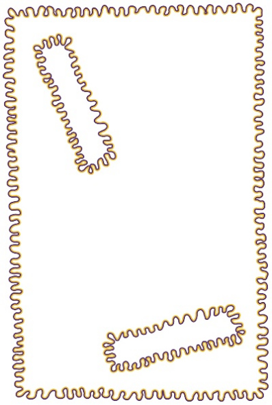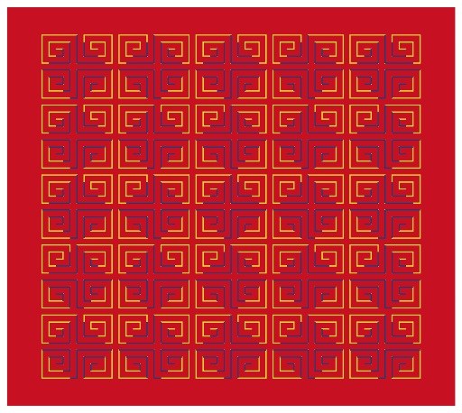 受水彩效应启发,日本视觉科学家Seiyu Sohmiya发现了波浪线错觉。在北冈秋吉绘制的这幅错觉图中,波浪线后面的白色背景似乎也染上了与线条同样的颜色。
