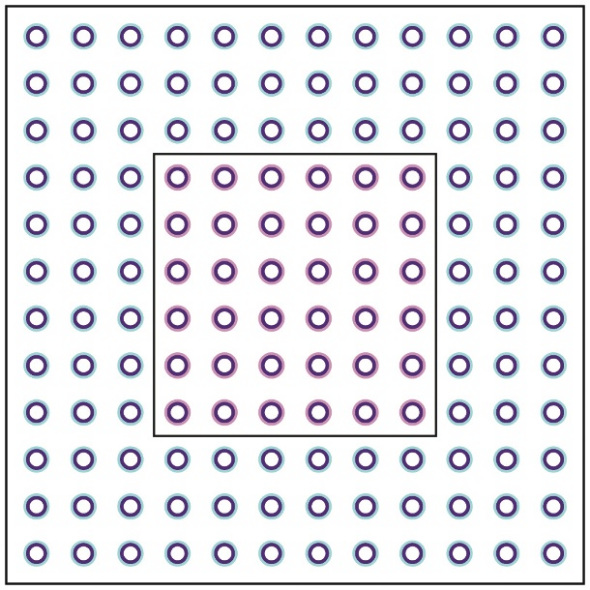 在这幅由皮纳绘制的错觉图中,内部方框内的圆点似乎被紫雾包围,外部方框则似乎充满蓝色。这种错觉由水彩效应所致。