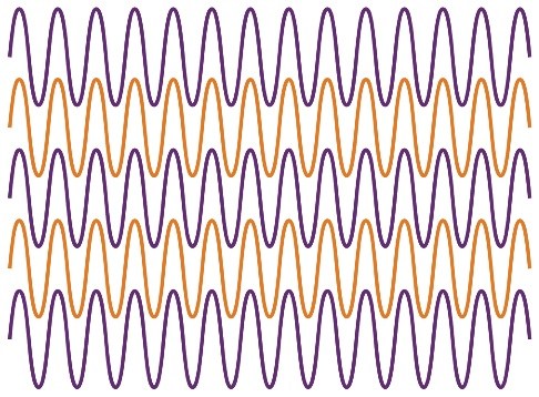 蓝线后面的红色看上去似乎呈洋红色,黄线后面的红色则似乎呈橙色。这种颜色同化现象说明颜色能够在某些情况下彼此混合,而不是彼此形成对比。