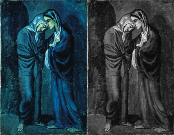 在蓝色时代,帕布罗·毕加索纵情于深浅不同的蓝色,创作绘画作品,无论是影子还是阳光的渐变都被披上一件蓝衣。如果一切都用错误的颜色加以呈现,我们又如何分辨人、沙和灰蒙蒙的天空呢?哈佛医学院的玛格丽特·利文斯通表示,虽然毕加索使用蓝色,但他同时也对画作中的亮度关系进行巧妙处理,使其在光照条件下形成对比,进而让人们通过亮度变化欣赏他的作品。在右侧的灰度图中,亮度关系显得更为明显,我们很容易对画中的人与物进行分辨。这也就是为什么色盲人群能够和正常人一样生活,有时候,他们甚至不知道自己有这种缺陷。