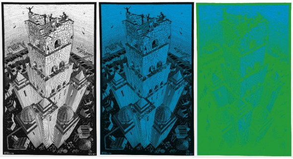 利文斯通及其哈佛医学院的同事大卫·胡伯尔将埃舍尔的木版画《巴别塔》(左图)中的白色区域填充浅蓝色(中图)。这个时候,我们仍可以看到巴别塔的身影,因为亮度关系仍保持完整。但如果用亮度与蓝色区域(之前的白色区域)相同的绿色填充黑色区域(右图),巴别塔就变得一团糟。我们的视觉系统无法只根据获取的颜色信息,辨别体积、形态与距离,要做到这些,还必须获得亮度信息。