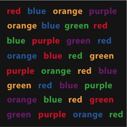 这是一幅大名鼎鼎的视觉错觉图,让欣赏者大脑内的语法与符号处理系统爆发一场冲突。一个接一个地浏览这些单词,中间不停顿或者减慢速度,同时大声说出单词的颜色而不是单词本身,你能够做到准确无误吗?毫无疑问,做到这一点并非易事。在此过程中,你会受到斯特鲁普效应的影响。这种效应以心理学家约翰·瑞德雷·斯特鲁的名字命名。即使尝试不去读这些单词,你也无法避免单词代表的含义与它们的颜色爆发冲突。