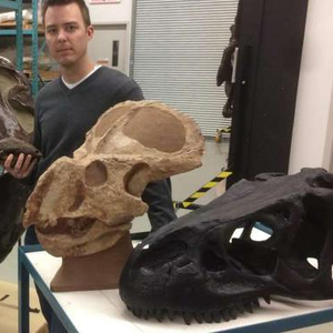 乔丹•马伦博士站在加拿大自然博物馆的复制恐龙化石藏品之间。这些恐龙头骨属于4个此前进行过两性异形研究的物种:暴龙(Tyrannosaurus rex,最大的头骨)、脆弱异特龙(Allosaurus fragilis ,右侧黑色头骨)、安氏原角龙(Protoceratops andrewsi)和直立剑角龙(Stegoceras validum,手中头骨)。