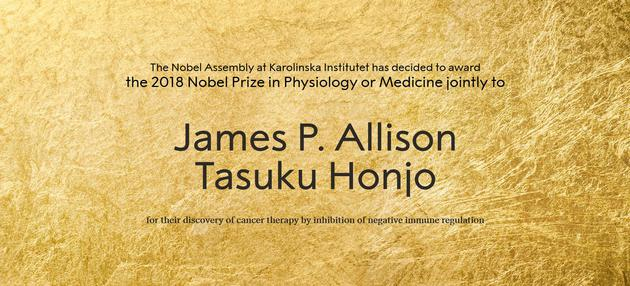 新浪科技讯 北京时间10月1日消息,据国外媒体报道,诺贝尔生理学或医学奖刚刚揭晓! 2018年诺贝尔生理学或医学奖授予两位免疫学家:美国的詹姆斯·艾利森(James P。 Allison)与日本的庶佑(Tasuku Honjo) ,以表彰他们“发现负性免疫调节治疗癌症的疗法方面的贡献”。