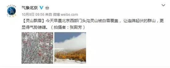 通常,高海拔山区的气温比平原地区更低,复杂的地形又有利于降水的发生,所以多年来北部山区的降雪一般都出现的比较早,而作为北京第一高峰的灵山一般都是在10月份迎来当地的第一场雪的。