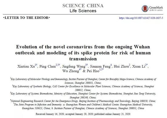 通过对这些数据的分析,2020年1月21日,中国科学院上海巴斯德研究所郝沛研究员、军事医学研究院国家应急防控药物工程技术研究中心钟武研究员和中科院分子植物卓越中心合成生物学重点实验室李轩研究员合作,在SCIENCE CHINA Life Sciences上在线发表了题为“Evolution of the novel coronavirus from the ongoing Wuhan outbreak and modeling of its spike protein for risk of human transmission”的论文,为我们认识这种新型病毒又提供了重要线索。(戳“阅读原文”看论文)