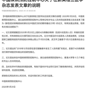 对此,中国疾控中心 1 月 31 日晨间发布说明回应称,研究为回顾性分析,所有病例在论文撰写前已向社会公布;而医务人员感染情况已经于 1 月 20 日对外公布。