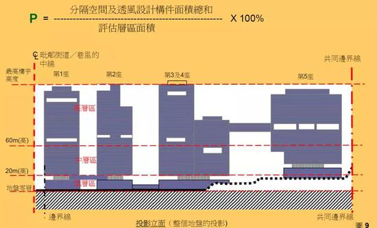值得一提的是,这个指引首次针对香港高密度高层建筑居多的状况将建筑高度分为低层区(0-20m),中层区(20-60m)及高层区(60m以上)评估区域,每个层区都有具体针对楼宇间距和空洞的定量计算要求。