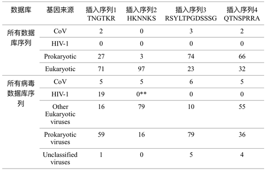 我们将2019-nCoV病毒、其他冠状病毒和HIV-1病毒的序列与GenBank数据库的序列进行了仔细的比对,并没有发现这四个插入片段是HIV-1所特有的,亦或是2019-nCoV病毒从HIV-1获得了这些插入片段的证据。首先,在GenBank数据库中对这些病毒基因进行序列比对的结果表明,前100个相同或高度同源的序列均来自哺乳动物的宿主基因、昆虫、细菌等 (表1) 。比对结果只有几个显示与冠状病毒同源,但它们均与HIV-1病毒无关。病毒序列数据库的比对结果还显示,这些序列广泛地存在于从噬菌体、流感到巨型真核病毒等不同类型的病毒中 (表1) 。这些结果清楚地表明,插入的基因序列广泛存在于包括病毒在内的各种生物体中,绝不是HIV-1所特有的。当用2019-nCoV病毒的序列在整个数据库中进行检索时,我们发现它与冠状病毒的匹配程度更高,仅有少数与HIV-1相匹配(表1)。并且,虽然有19条记录显示插入片段1和2与HIV-1能够完全匹配,但插入片段3和4与HIV-1的匹配率很低(仅有42%到88%匹配)。另外,插入片段4能够与HIV-1基因组中的多个不同基因片段(包括gag、pol和env)进行模糊匹配,这表明它们之间的同源性太低(低于42%),因此并不可信。此外,在HIV数据库中检索这四个插入片段,我们也能得到相似的结论(https://www.hiv.lanl.gov/components/sequence/HIV/search/search.html)。在任何HIV-1中均未发现与插入片段3和4完全匹配的序列,这也说明插入的基因序列广泛的存在于包括病毒在内的各种生物体中,并非HIV-1所特有的。另一方面,HIV-1囊膜蛋白中与之匹配的的区域都具有高度可变性,常常存在大量的插入和缺失突变,这也表明这些片段对于HIV-1囊膜糖蛋白的生物学功能来说并不是必需的。同时,与插入片段1和2完全匹配的序列仅能在少数的HIV-1病毒株中检测到,说明在数以万计的天然HIV-1中同时存在这四个插入突变的序列也是非常罕见甚至并不存在。这也解释了为什么这四个插入片段独立存在于不同的HIV-1基因组中的原因[8]。由于这些插入片段与HIV-1的同源性低,在HIV-1序列中也非常少见,因此我们认为HIV-1并非是2019-nCoV基因组中插入序列的来源。