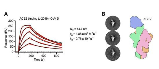▲新冠病毒S蛋白与ACE2有较高的亲和力;右图为负染色电镜的二维示意图,蓝色为ACE2受体,S蛋白三聚体以其他3种颜色标注(图片来源:参考资料[1])