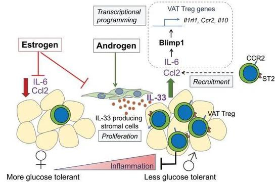 这些基质细胞在雄性激素的刺激下产生信号分子,为调节性T细胞打造一个更合适的微环境,吸纳更多的调节性T细胞进入脂肪组织。这套机制仅在雄性中存在,相反在雌性体内,雌激素的作用会限制脂肪组织中的调节性T细胞增多。