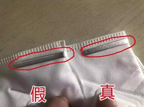 金属条其实也有明显的不同,真口罩表面没有那么光滑,而假口罩表面非常光滑。