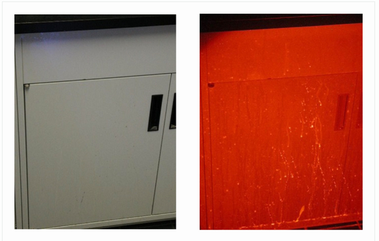 荧光越来越明显。这就意味着,哪怕罪犯自作聪明地打扫了犯罪现场,看上去干净的表面在蓝光下就是另一番景象了。
