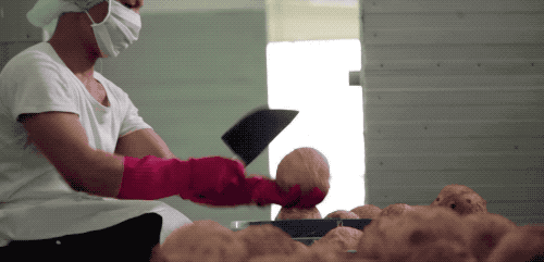 制作椰果的原材料一般是椰子水~出去玩时,我老看到小摊上卖椰子的老板会先挖个洞,再戳根吸管给你喝。可工业批量制造,就简单粗暴太多了,大刀(背)向椰子头上砍去!