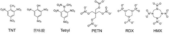 1877年合成的Tetryl(音译特屈儿),1894年合成的季戊四醇四硝酸酯(俗称太安、PETN),1899年合成的环三亚甲基三硝胺(RDX、音译黑索金),以及1941年发现的环四亚甲基四硝胺(HMX,俗称奥克托今),形成了目前使用的三大氮系(硝基化合物、硝酸酯及硝胺)单质炸药[10]。其中HMX以稳定性好、合成容易、具有更高的能量密度和爆速,逐渐取代了TNT在军事中的应用,成为第三代“炸药之王”,并衍生出更多的混合炸药。