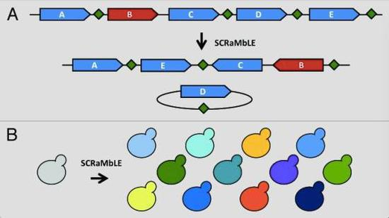 那么,人造酵母和自然界的酵母真的没有区别吗?当然不是,在尽量模拟自然界酵母的基础上,科学家们在合成的DNA上做了一些细微但重要的改变。例如,科学家们去除了DNA上一些他们认为无用累赘的序列,作了一些遗传密码的同义改写,并在基因上加入了一个“进化开关”,给每个合成酵母一次进化的机会。科学家们通过引入一种叫做SCRaMbLE的进化系统(图4),在经过诱导之后,能使每个酵母细胞的全部基因像洗牌一样发生一次随机的重新排列。这就给人工合成的酵母菌带来了无限的可能,让酵母菌在这无限的可能中找到更好的自己。