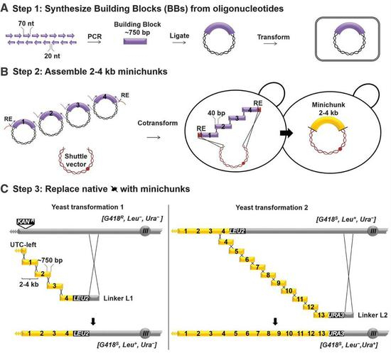 很遗憾,由于细胞的成分结构太复杂,科学家还无法通过化学方法直接合成出细胞的全部成分。但是没关系,也没有必要重新合成那么多复杂的东西。有更简单直接的办法——合成操纵着生命核心密码的DNA。首先,科学家们用电脑程序重新设计了酵母菌的DNA序列,然后通过化学合成的方式合成出寡核苷酸链(就是超级短的DNA)。因为化学合成越长的DNA越容易出错,成本很高,穷苦的科学家们hold不住啊。所以只能先合成短的DNA,再像拼积木一样拼接出长的DNA。你问为什么不直接化学合成全部DNA?我只能告诉你…