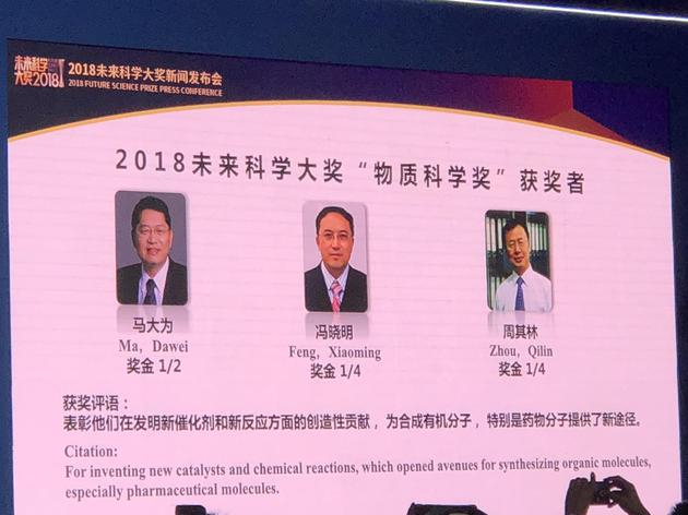 新浪科技讯 9月8日下午消息,2018未来科学大奖今日在北京揭晓,马大为,冯小明,周其林获物质科学奖,三人将分享100万美元大奖,马大为来自上海有机化学研究所,获得奖金的二分之一;冯小明来自四川大学,获得奖金四分之一;周其林来自南开大学,获得奖金的四分之一 。
