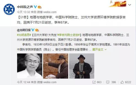 据@中科院之声 消息,地理与地貌学家、中国科学院院士、兰州大学资源环境学院教授李吉均,因病于7月21日逝世,享年87岁。
