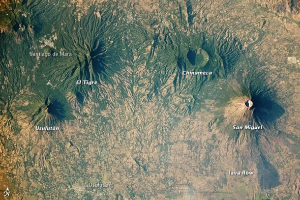 新浪科技讯 北京时间4月27日消息,据美国宇航局官网报道,在中美洲的太平洋沿岸,有数量众多的火山。这些火山有的仍处于活跃状态,有的则处于静止状态,它们沿着海岸线排成一条长长的火山带。这条火山带被地质学家称为“中美洲火山弧”。2010年3月31日,国际空间站宇航员从太空拍摄了位于萨尔瓦多境内的“中美洲火山弧”中段部分的火山群。