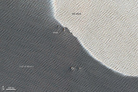 第一幅图由“Aqua”卫星上的中分辨率成像光谱仪所拍摄,以更宽的视觉展示了原油污染区。在图片的中心,是密西西比河三角洲,右侧则是呈现漩涡状的银白色浮油。由于原油污染区正处于海面太阳耀光区域,因此浮油显得特别的明显。第二幅图由“地球观测1号”卫星上的先进陆地成像仪所拍摄,以更近的视觉展示了原油污染区的细节。从图中可以看到船只驶过时在海面上产生的波浪,这些船只可能正在进行原油清理和污染控制工作。