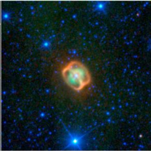 这一环状结构可能是由一对双星喷射出的尘埃形成的。这两颗双星一颗是比太阳质量更大、温度更高的巨星,另一颗则是致密的白矮星。随着巨星逐渐衰老,它的外层气壳向外扩散,在两星周围形成了一个巨大的气泡。从白矮星喷出的物质喷流冲击气泡,于是形成了在WISE红外图像上见到的橘色环状结构。而图像中的绿色云则是早先喷射出的物质,这在可见光波段中呈蓝色。