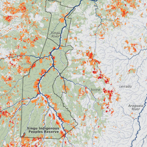 一般的理论认为,森林砍伐和林下火灾紧密相关,因为森林砍伐在树冠层中造成了间隙,暴露在阳光下的森林地面会变得干燥易燃。但是,这幅地图表明,林下火灾和森林砍伐之间没有相关性。事实上,即使在很少或根本没有进行森林砍伐的地方——如亚马逊兴谷河流域(Xingu River Basin)中为巴西土著人留下的森林保护区——也有大量的林下火灾,而且其中一些地区火灾频繁。